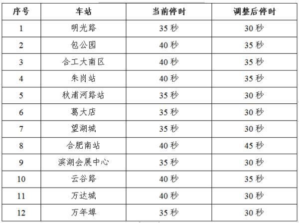 其中,1号线方面,合肥火车站到达停站及折返时间(即列车到站时间与发车时间之间的时间间隔)由3分30秒压缩至2分20秒;九联圩站到达停站及折返时间由4分35秒压缩至3分45秒。