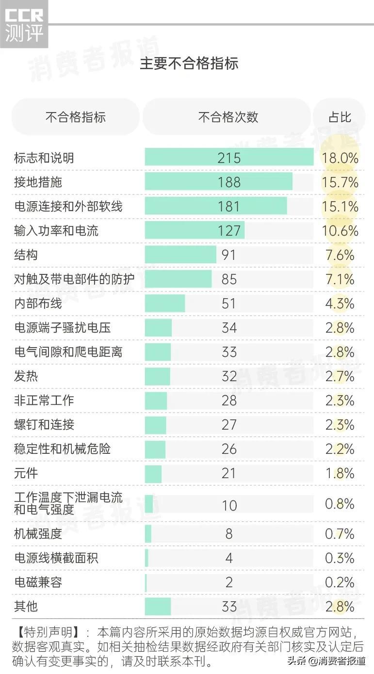 一、标志和说明 ,有215批次不合格。标志和说明是指产品铭牌或者使用说明等,包括电压、功率、器具型号、规格等标识,如果标志和说明缺失或不规范,用户可能无法安全、正确地使用器具,有安全隐患。比如为Ⅱ类器具的标称品牌“松桥”取暖器,其产品说明书上并未按规定标出Ⅱ类器具的符号。比如标称由嘉兴市顶王电气有限公司生产的“顶王”牌“多功能取暖器”(型号规格:DW;生产日期或批号:2016.12),额定电压和额定输入功率内容缺失。一旦消费者误操作,易引发触电、着火等危险。