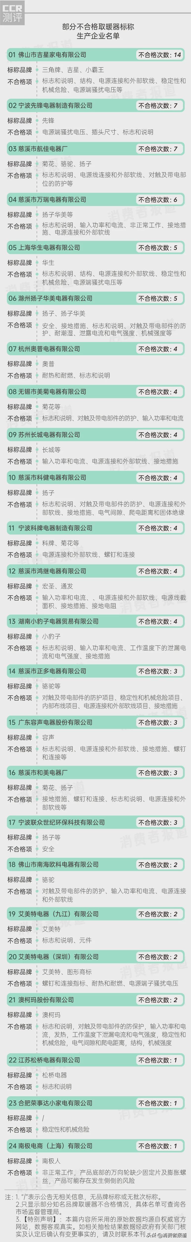 其中标称生产企业为佛山市吉星家电有限公司的取暖器被检出14批次不合格,涉及品牌为“三角牌”“吉星”“小霸王”。