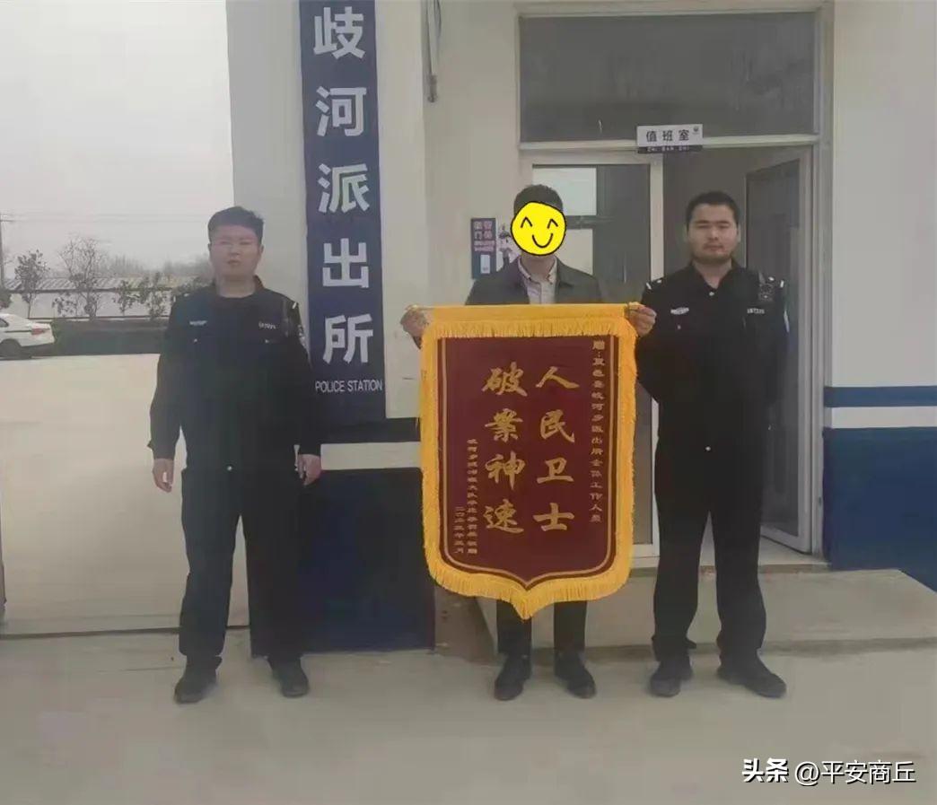 近日,群众季某将一面印有“人民卫士 破案神速”的锦旗送到夏邑县公安局歧河派出所民警手中,向民警为其追回被骗钱款而表示感谢。