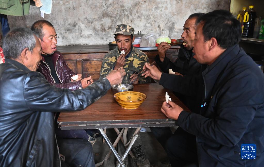 10月12日,在山西省汾西县本家庄自然村,胡志荣(右一)和村民吃中午饭。新华社记者 柴婷 摄