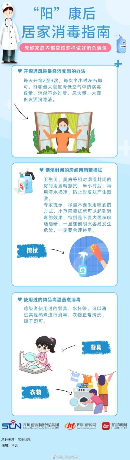 “阳”了怎么办?抗原怎么测?“阳”过多久可以复工返岗?居家如何清洁消毒…… 为了和大家一起科学抗疫,四川新闻网-首屏新闻推出了抗“阳”科普系列海报,给大家科普有关新冠防治的权威信息。感染新冠病毒居家康复后,家庭内部应该怎样做好消杀清洁?怎样消杀效果最好?这份攻略要收好