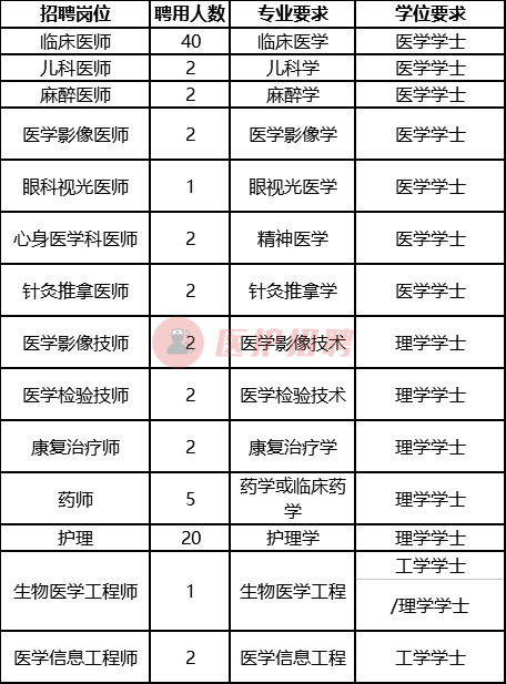 A类岗位:40名。“双一流”高校本科及以上学历学位、其他高校硕士研究生及以上学历学位,不设具体岗位及岗位聘用人数。临床医学类、口腔医学类、医学技术类、护理学类、针灸推拿学、康复治疗学、药学、临床药学、生物医学工程、医学信息工程等医疗医技相关专业。