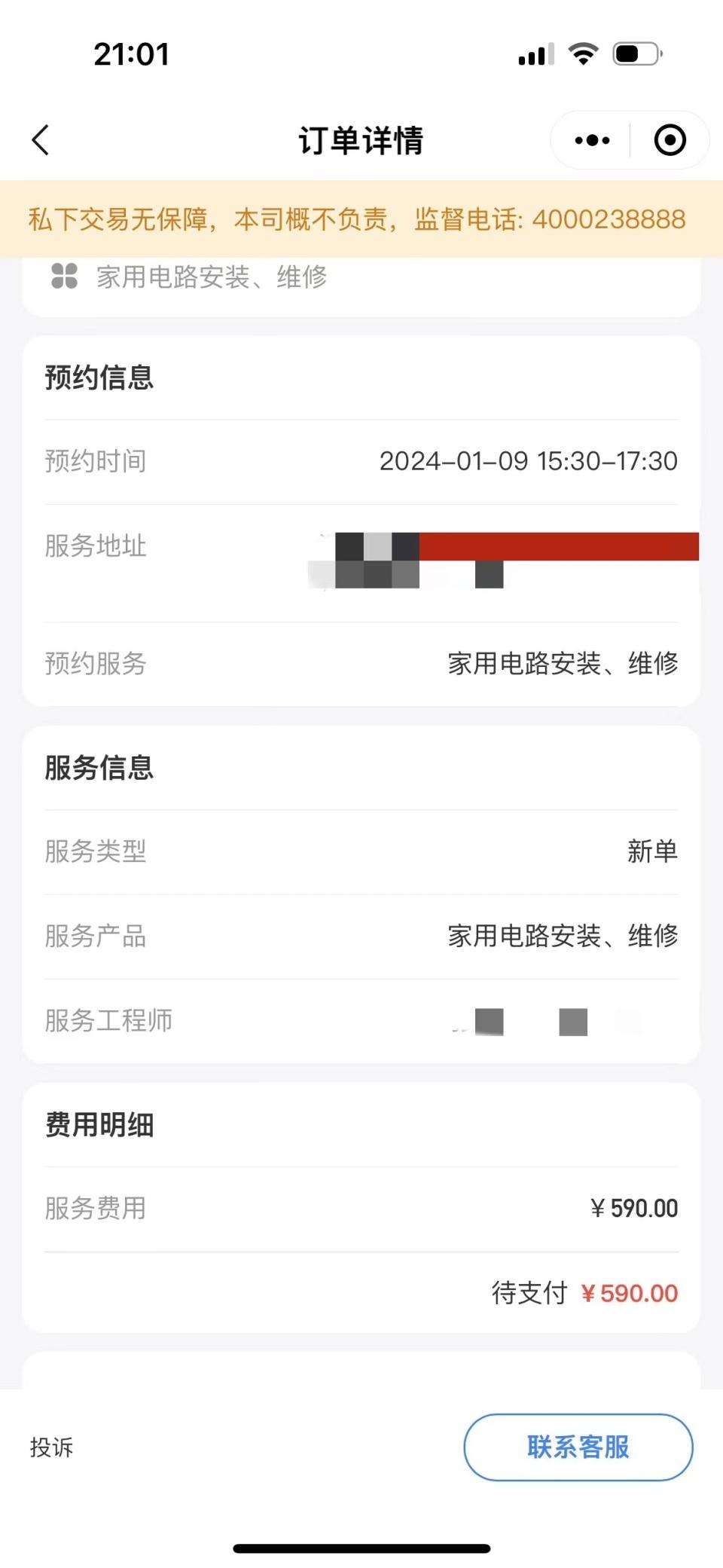 “两个啄木鸟维修的师傅上门来看,一共要维修4个电位,报价1100元,”邹女士说,“师傅给人的感觉也不太专业,检测过程中一直说房子不错,小区不错,两人交谈之间还互相问问有没有信心(修好),有宰客的感觉。”最后,邹女士把价格从1100元谈到了590元,师傅表示第二天上门维修。但在社交媒体查看到很多踩坑经历后,邹女士连夜取消了订单。
