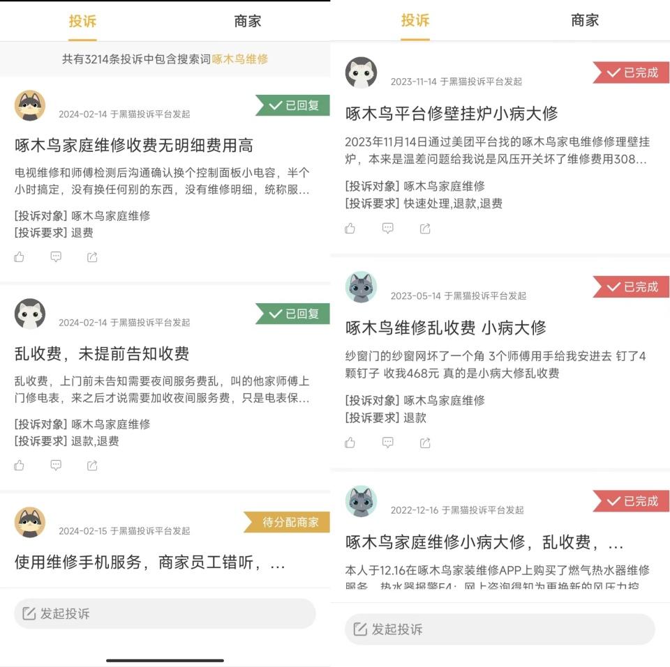 中新经纬在黑猫投诉平台上搜索“啄木鸟维修”,共计搜索到3214条投诉内容。不少业主也在社交媒体上分享了使用啄木鸟维修的“踩坑经历”,其中“定价虚高”“师傅乱收费”是消费者们普遍指出的问题。有网友将其称为“维修刺客”。