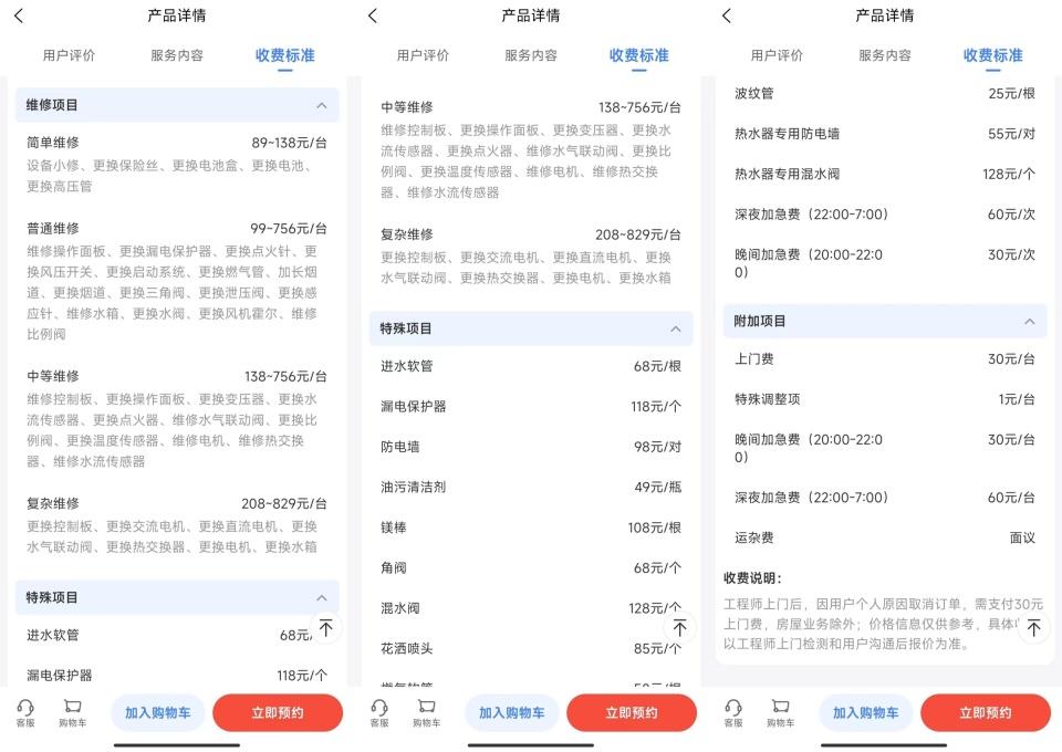 在啄木鸟维修APP上,其预约界面有明确的收费标准。以电热水器维修项目为例,简单维修为106-406元一台,复杂维修在256-2098元一台,特殊项目以及附加项目也公布了收费明细。