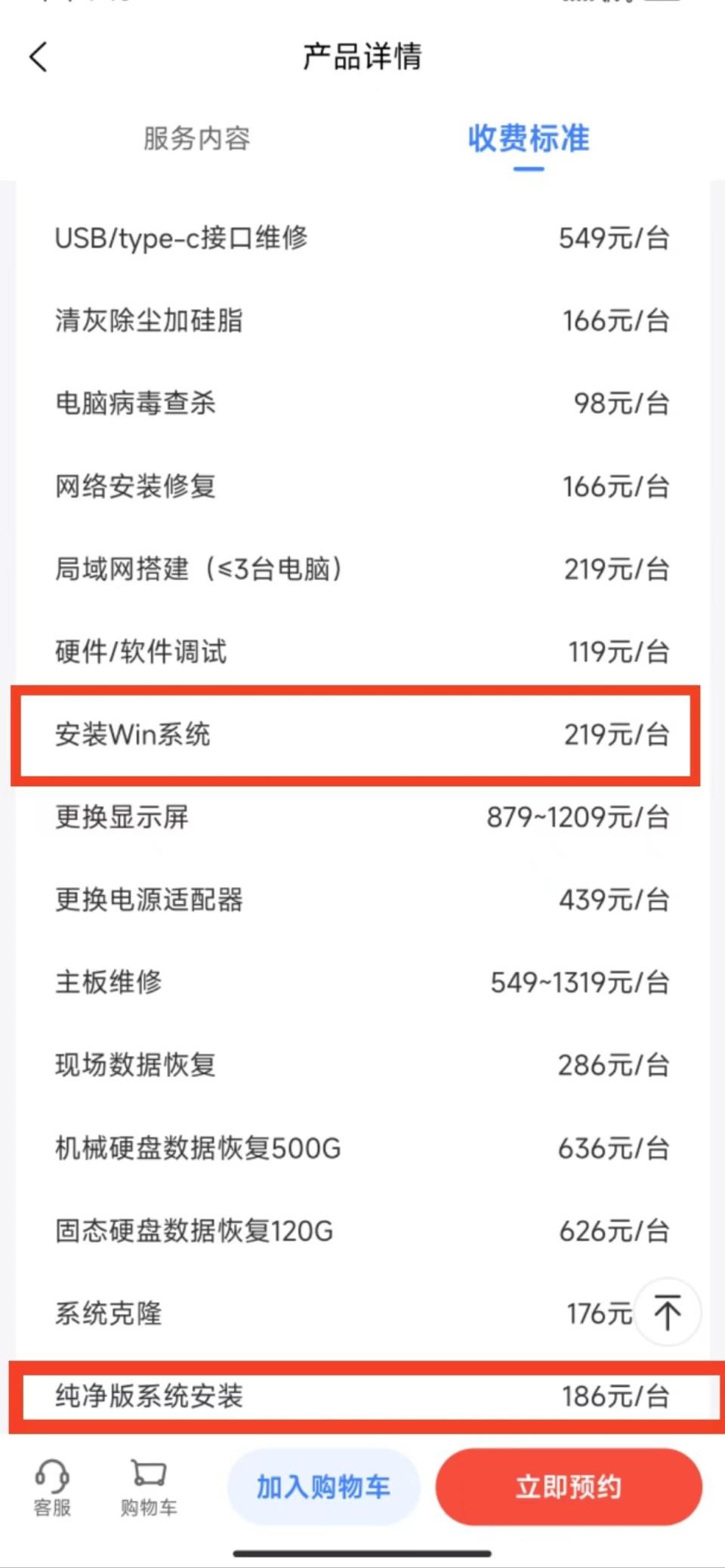3月14日,中新经纬浏览啄木鸟维修APP发现,以Windows笔记本维修的收费标准为例,安装Win系统收费219元/台,纯净版系统安装收费186元/台。