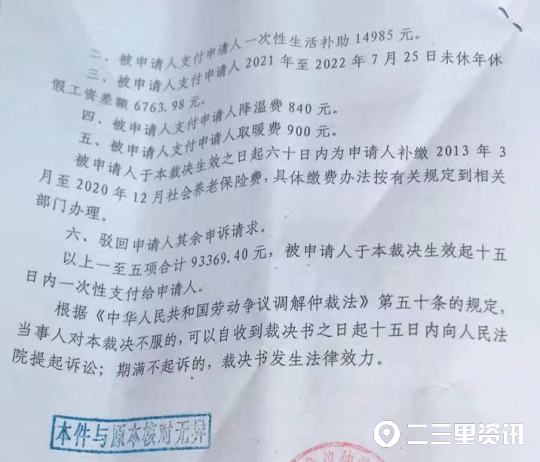 刘先生向记者出示了宝鸡市劳动人事争议仲裁委员会裁决书,记者在裁决书上看到“被申请人于本裁决生效之日起六十日内为申请人补缴2013年3月至2020年12月的养老保险费,具体缴费办法按有关规定到相关部门办理”,落款时间为“2022年9月16日”