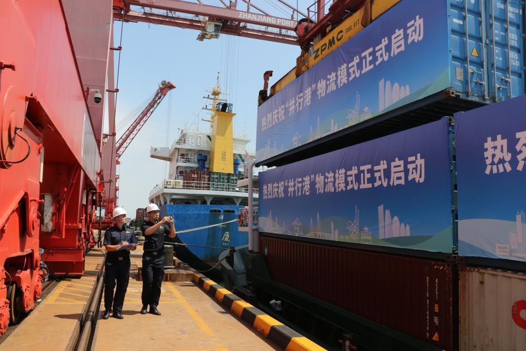 9月26日,湛江海关关员在检查“并行港”物流模式下的货柜。当日,“南航757”轮船自广东湛江港启航,将途经海南洋浦港、深圳蛇口港,卸装集拼三地的内外贸货物,最终前往亚欧国家。这标志着“并行港”物流模式改革试点首票业务成功开通。新华社发(黄翔 摄)