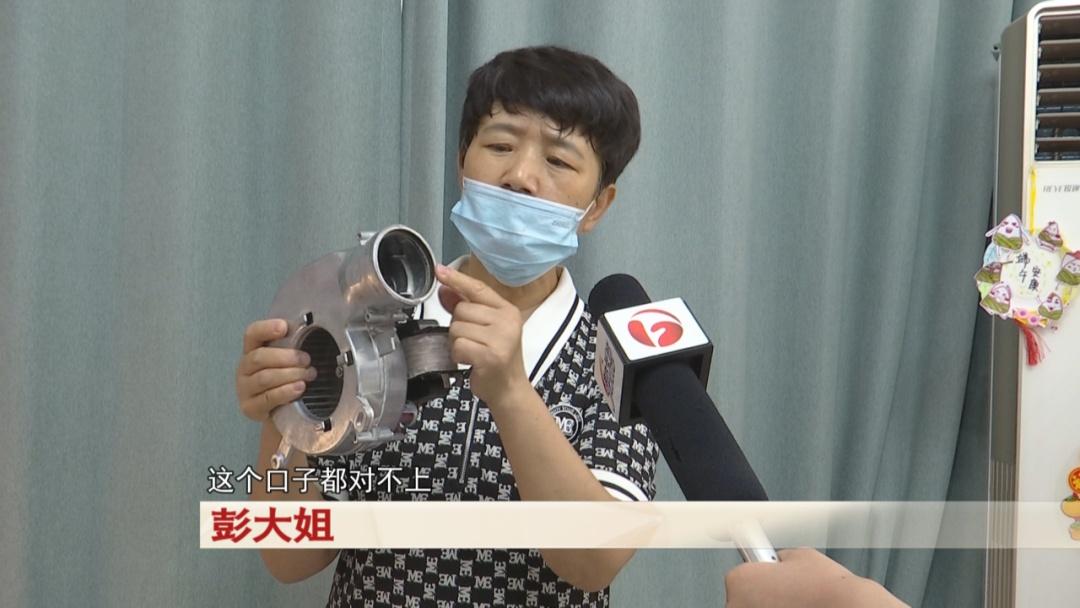彭大妈:当时有两个螺丝没上上,这个口子也对不上,他走了以后我们打电话过去,他说没事的,我们当时以为是新的机器上面带的额外的螺丝,就没在意。