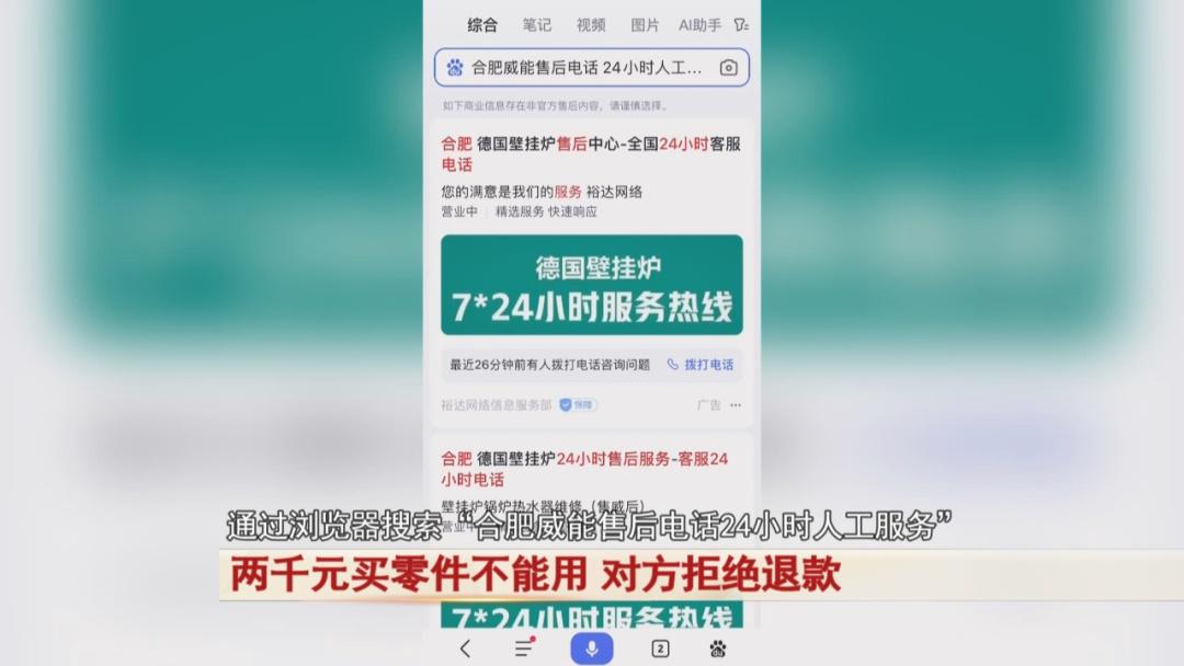 随后,记者模拟彭大姐当天寻找维修师傅的过程,通过浏览器搜索“合肥威能售后电话24小时人工服务”,拨通了客服电话。