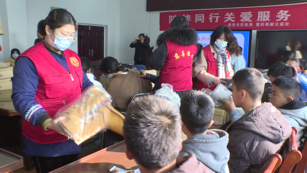 清江浦区“爱的奉献”公益社志愿者来到黄码乡中心小学,为这里的贫困留守儿童送来了暖冬物资。