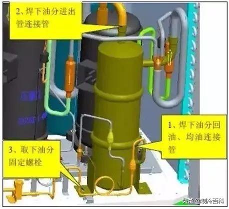 如果变频压缩机损坏,或者是定频压缩机内油质被污染时,需要拆掉变频压缩机,甚至更换油分离器和气液分离器