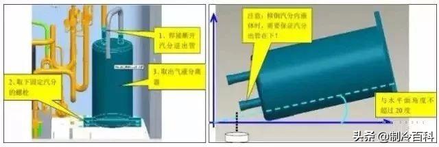 注意:要收集油分、汽分、储液罐内倒出的压缩机润滑油量,并做好相关记录,方便更换压缩机、汽分等原器件后,对系统进行润滑油的补充追加。