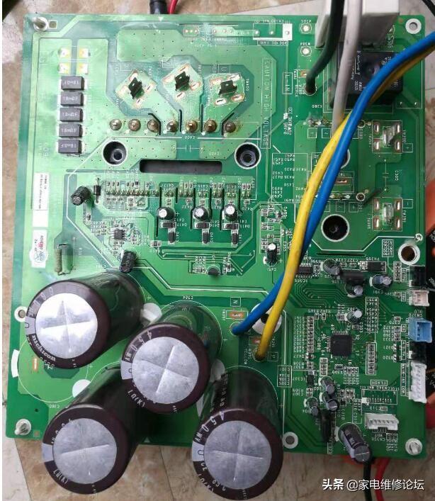 一台富士通小多联,手操器报警拆开外机,按确定显示故障代码E6.31变频器故障。1、PFC模块明显看到炸管2、变频板模块整流桥测量压降正常,但是主继电器不工作,CPU芯片供电正常,变频板故障灯不亮,不闪烁。CPU坏了。这个机器变频板没有独立开电源,电源由主控板提供,18V和15V。变频板大电容就算没有电压,CPU也能工作。更换PFC模块,变频板解决问题。(作者:msms)