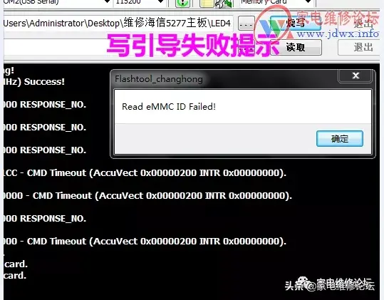 本人修板纯属小白,不对之处请高手指正!同行一台海信液晶电视机LED55EC280JD(BOM2)不开机,只拿主板7.820.5277就转手到我这,放置好久了。接上主板12V供电,测量5V、3.3V、1.5V、1.2V均正常,连上编程器无打印,试写引导mboot提示“Read EMMC ID Failed!”,意思是读EMMC失败!