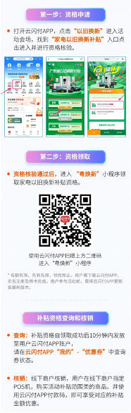0 4 补贴资格领取通过银联云闪付“以旧换新”专区或京东、唯品会等APP搜索“广州以旧换新”关键字进入活动页面,点击进入“领取补贴资格”页面,根据需求选择相应品类领取补贴资格券,消费者在付款时,按照剔除该商户的所有优惠后成交价格的基础上再享受政府购置补贴。