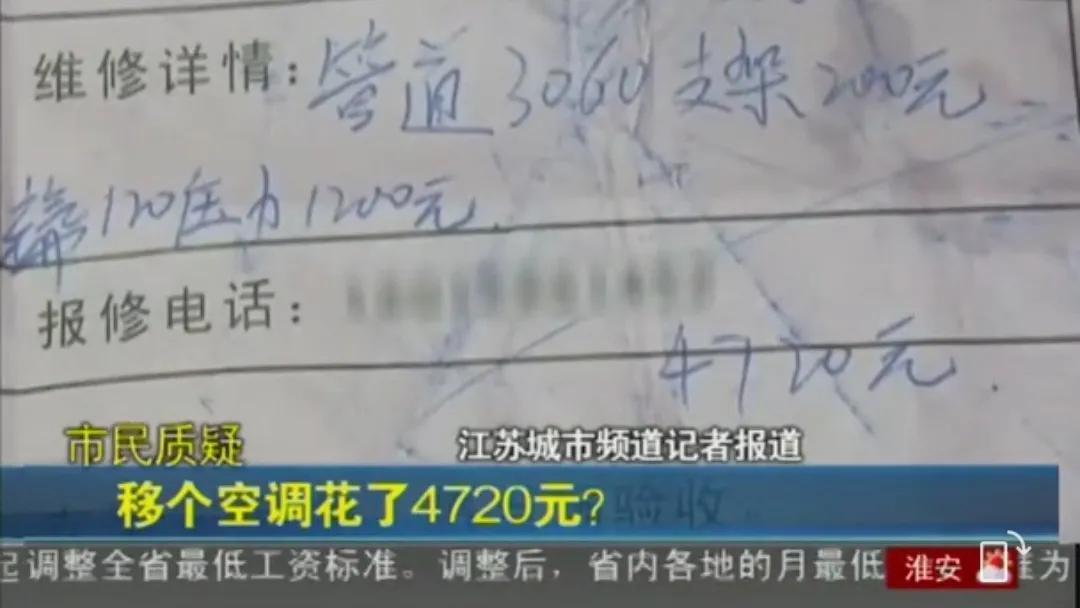 江苏李女士家里空调需要移机,因为没有熟悉的安装师傅,所以在报纸上的小广告找到一家空调安装公司,商家报价空调移机费用为260元,李女士觉得价格也合适,所以让安装师傅过来安装,那成想最后结账4720元,事后李女士越想越生气,随后联系电台记者曝光,记者到了以后听完李女士的叙述,也明白了事情的经过,记者看到安装师傅提供给李女士收款单据上面标注的空调移机费用确实是二百六十元。但是在维修详情一栏却写着管道费用三千零六十元,空调外机支架两百元,充氟一千两百元,各项合计共计四千七百二十元。