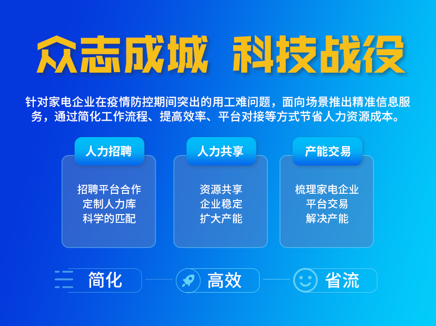 针对家电企业在疫情防控期间突出的用工难问题 ,面向场景推出精准信息服务,通过简化工作流程、提高效率、平台对接等方式节省人力资源成本。
