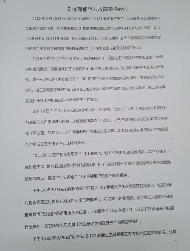 3月21日,南都记者随后跟随商铺业主来到东江学府物业管理中心,客服部苏主管接待了记者。据其介绍,自从今年2月19日以来,他们已多次接到有关2栋商铺电力故障的投诉,“从2月19日开始到3月9日期间,由一天跳闸1次到一天多次跳闸,在不断跳闸期间物业维修部组织电工多次对2栋商铺电表箱检查,均未检查出电箱开关跳闸的原因”。为此,物业公司也专门整理了一份《2栋商铺电力故障事件经过》,内文介绍相关电力故障的检查和处理经过。不过截止目前,物业公司工程部仍然没能确定商铺反复断电的根本原因。