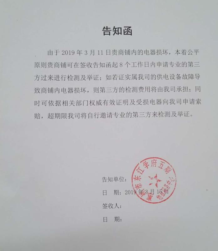 3月15日,物业公司发出《告知函》,内文称:“本着公平原则贵商铺可在签收告知函起8个工作日内申请专业的第三方来进行检测及举证;如若证实属我司的供电设备故障导致商铺内电器损坏,则第三方的检测费用将由我司承担;同时可依据相关部门权威有效证明及受损电器向我司申请索赔,超期限我司将自行邀请专业的第三方来检测及举证。”