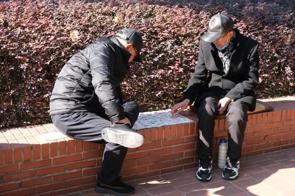 爷叔们在花坛边对弈