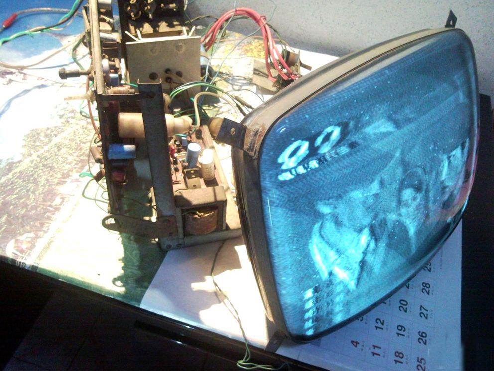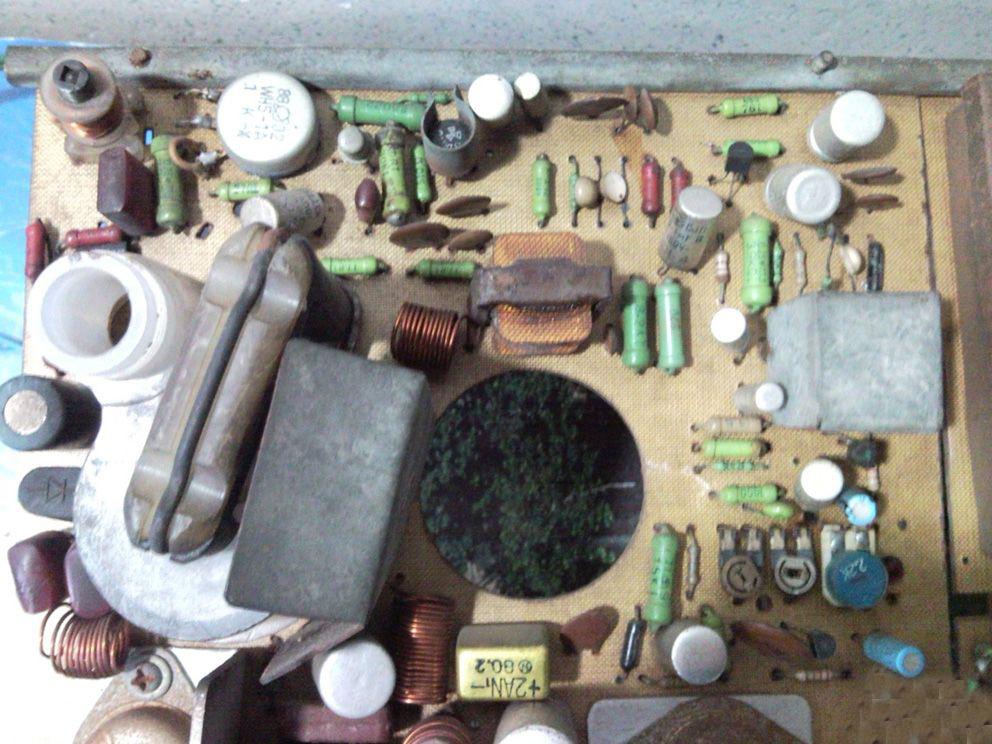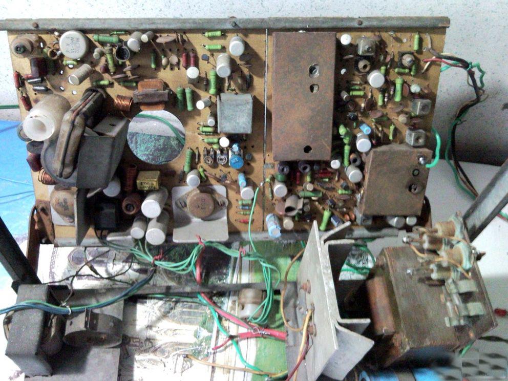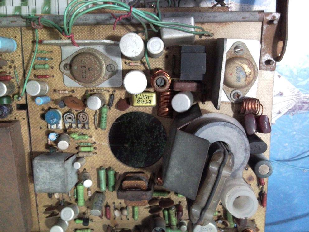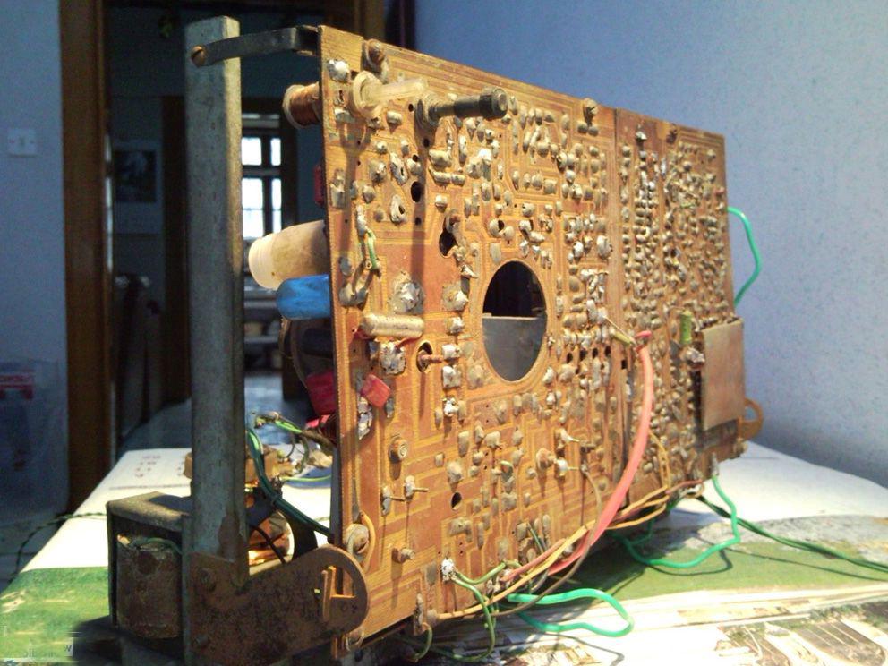 这台机由于年代久远和长时间未曾使用,机壳开裂、元件和铁架也氧化严重,接上电源后调整拉杆天线还能接收4个频道的电视节目,(室内接收天线受信号干扰使图像产生了重影)由于伴音电路的功放管的管脚锈断而无伴音,径更换伴音电路的部分元件后伴音恢复正常。
