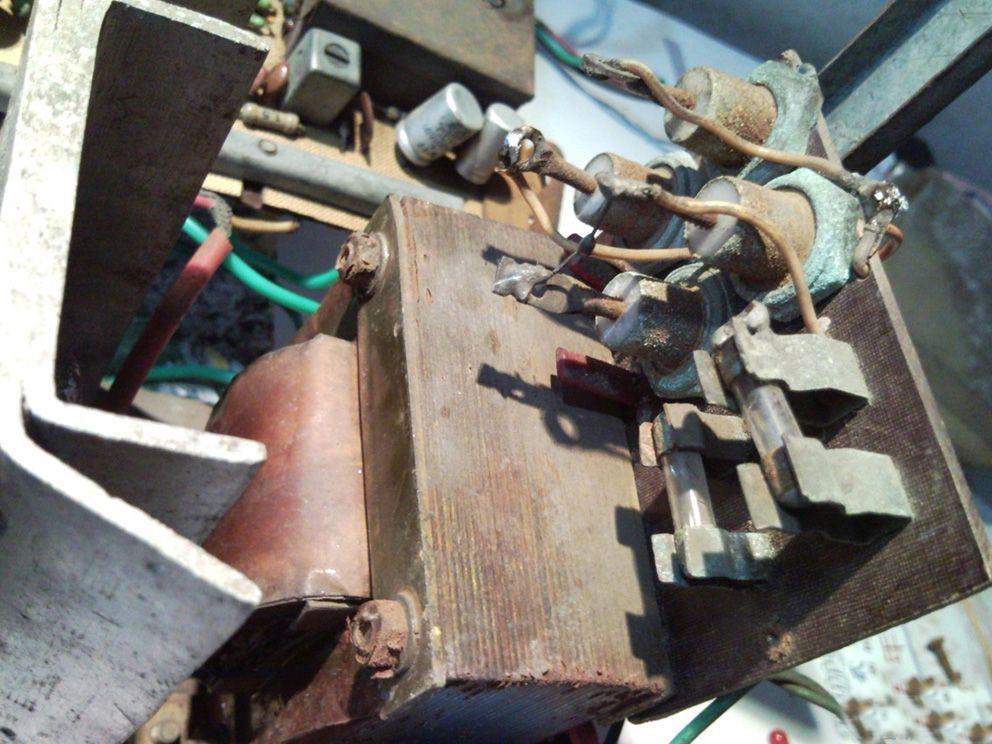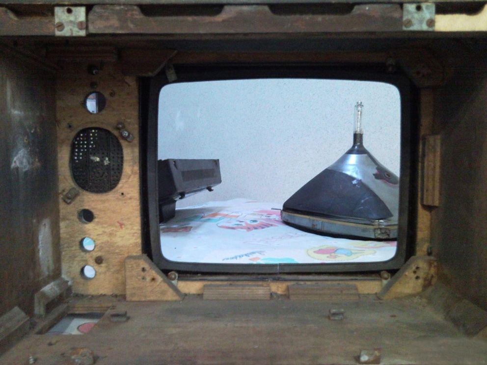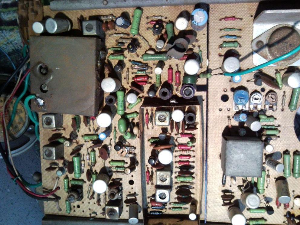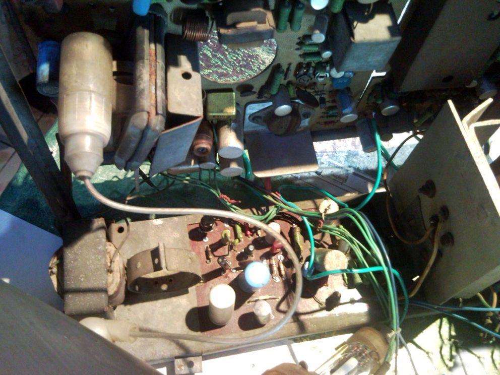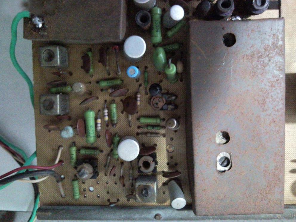 这台机由于年代久远和长时间未曾使用,机壳开裂、元件和铁架也氧化严重,接上电源后调整拉杆天线还能接收4个频道的电视节目,(室内接收天线受信号干扰使图像产生了重影)由于伴音电路的功放管的管脚锈断而无伴音,径更换伴音电路的部分元件后伴音恢复正常。