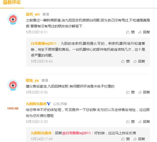 和讯网注意到,该贴发出后,九阳阳关服务于5月23日13:20回复表示反馈处理。不过截至5月25日发稿,该投诉贴尚未见进一步处理信息显示。