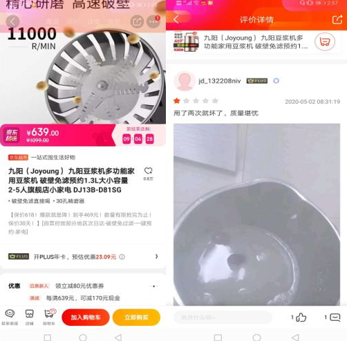 “最严重的是核心部件一年内居然可以坏好几次,第一次发生的时候找天猫官方交涉,迫于一年更换新机的承诺,第一次更换了整机。然而以为新机器故障率应该会好点,事实是更换的机器质量问题更严重,一开始使用出现打豆浆机器颤抖,打不碎,随后几个月电机就罢工了,拿到售后处理,说的是电机损坏,里面都烧焦了??而且听说是网购的九阳,直接就说质量肯定是和实体差一个档次!!”