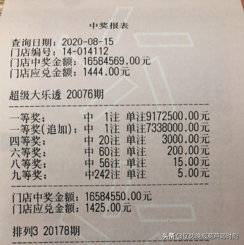 8月15日晚,中国体育彩票超级大乐透第20076期开奖。本期开奖号码:前区为01、08、18、28、30,后区为10、12最终号码为01、08、18、28、30、10、12。一等奖基本7注奖金9,172,500元,追加1注奖金7,338,000元。辽宁最幸运,辽宁基本1注追加1注)。中出这份大奖的就是位于葫芦岛兴城市友谊路锦华园北门14112体育彩票店。