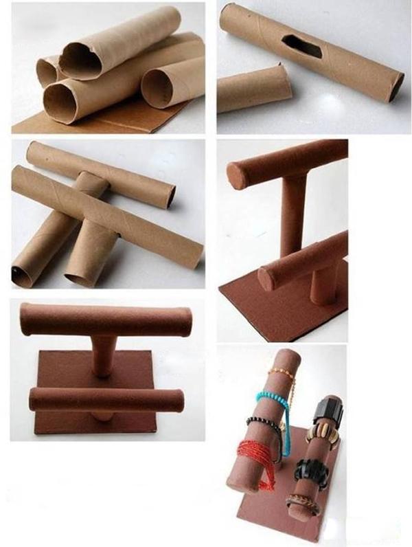 女孩子的饰品太多,堆在桌子上就像一堆废品一样,利用纸筒的圆形,将首饰一件件挂在上面,这样桌面干净多了。
