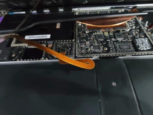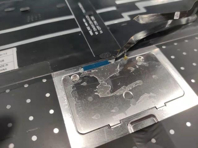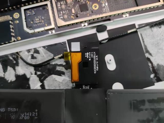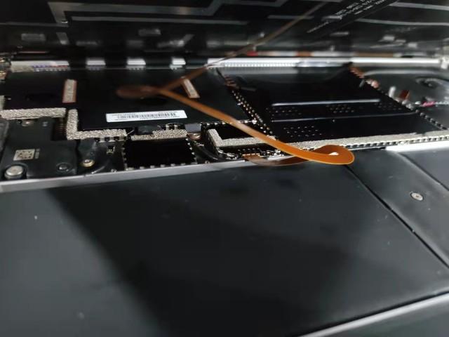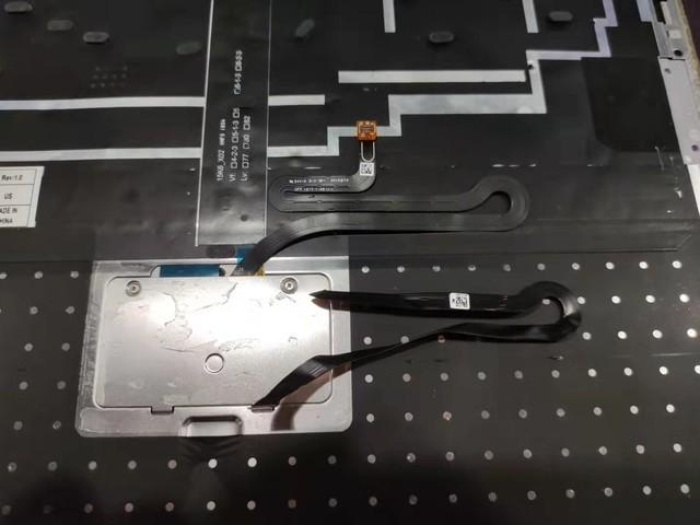 这里我们就可以看到键盘的排线还有C面连接主板的排线,我尝试轻轻地拔了一下这个排线,C面连接主板的排线是可以直接拔下来的。这就省去了我再继续拆里边这个小盖板,毕竟还是很难拆的,直接把新的排线从这里再插回去,嗯感觉还是很轻松的我都甚至觉得自己没有修好,不过后来测试了一下是OK的。这个C面和排线的问题目前就解决了。