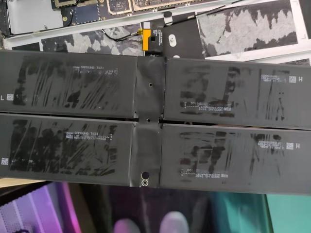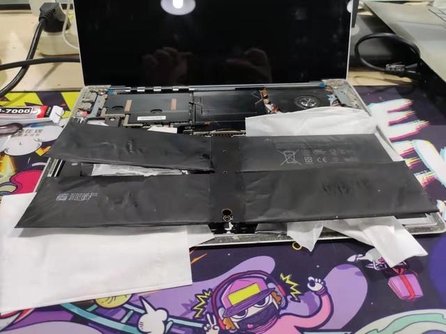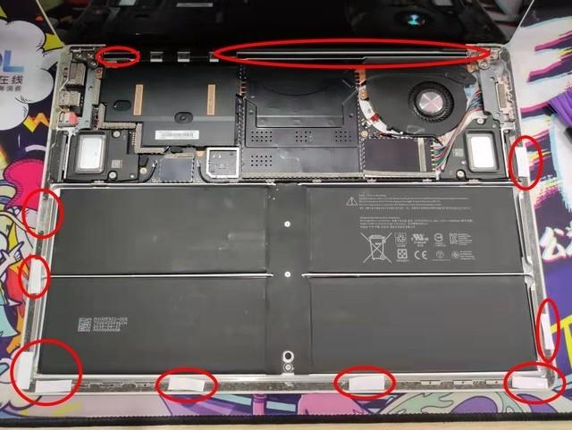 接下来是一个大工程,拆电池。我从网上搜了一下教程,微软Surface Laptop 2的电池排线是直接粘在主板下方的D面上的。这就很艰难,想要换电池就得先把主板拆了,这个主板上密密麻麻地设计了很多的盖板,每一个都是非常多的卡扣卡在上面的,只能一点一点的把它抠开。我这里想取个巧,先把电池拆下来,电池中间的盖板上有3个小的螺丝,先把它拧下来,但电池此时还是纹丝不动,因为这4块电池下面密布着大面积的双面胶,没有办法了只能强拆,我用2张非常硬的银行卡伸到电池下面儿把4块电池一一撬下来,其中大部分都被我弄坏了,内部的气体跑了出来,闻着很不舒服。