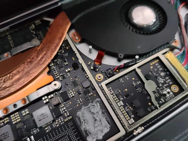 电池安装完毕之后就要开始复原,把之前已经放干变硬的硅脂都擦干净,然后均匀地涂上一些新的,当然涂硅脂是越少越好,顺便把这个风扇里边给清清灰,没想到这小小的风扇里边竟然还有芯片,怪不得成本那么高。把主体的散热装回去之后,我们先接上排线开机测试一下。