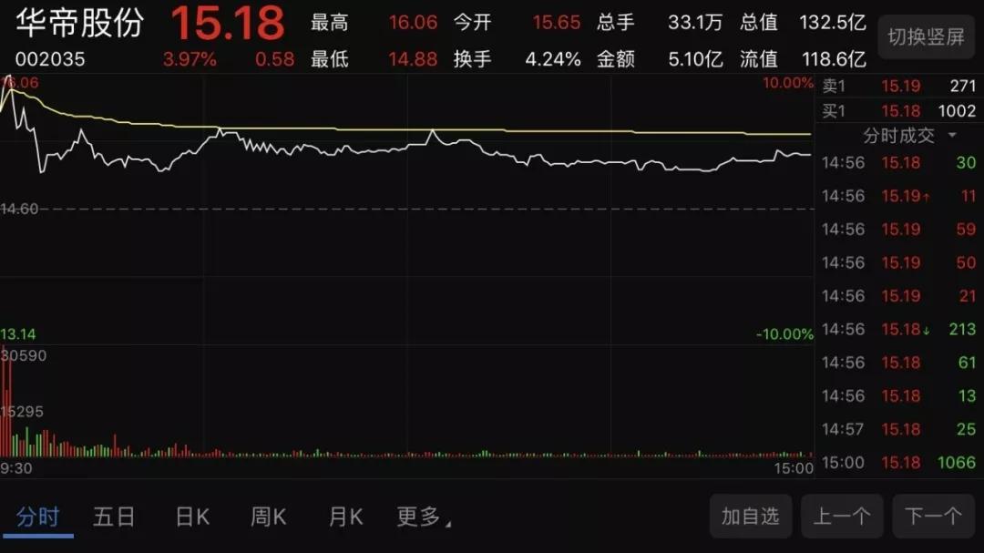 利好也反应在股价上,今天一早开盘,华帝股份以7.19%的涨幅跳空高开,开盘报15.65元,盘中涨幅最高达10%,封上涨停板,最后收盘涨幅3.97%。