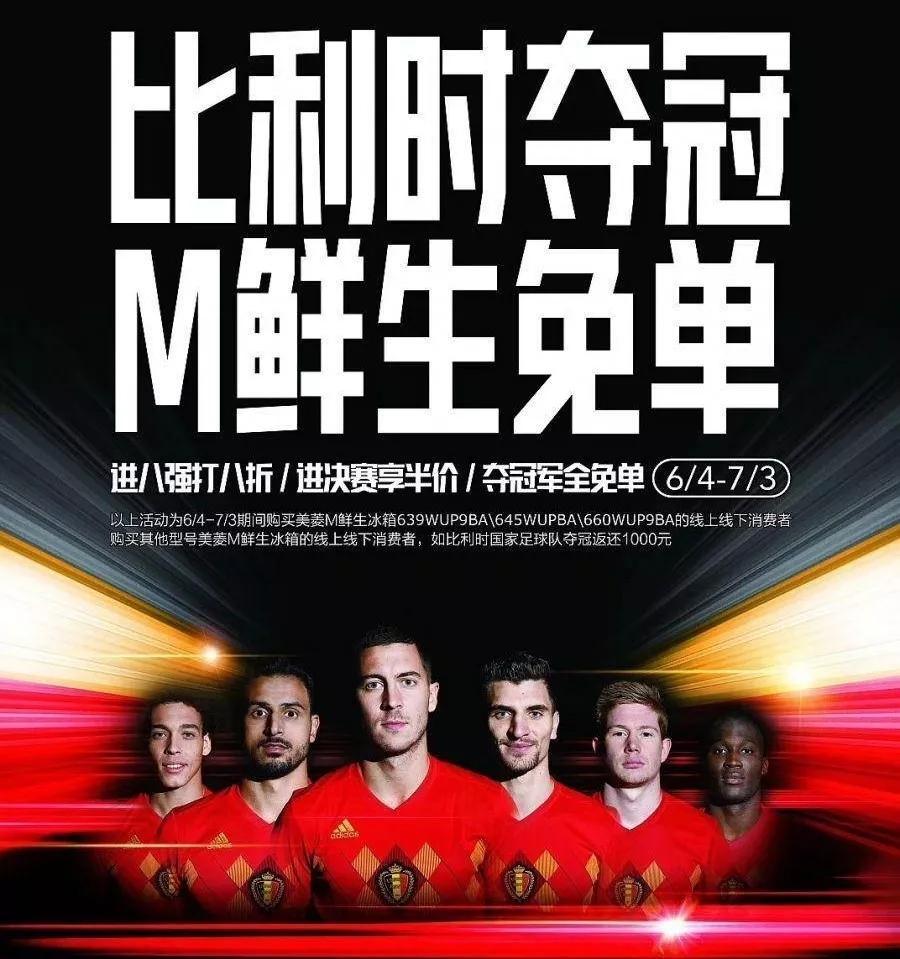 家用电器制造商美菱在6月初推出了"比利时夺冠 M鲜生免单"活动,喊出了“购买M鲜生冰箱享受免单”,“进八强打八折、进决赛打五折”的口号,美菱是比利时队的官方赞助商。