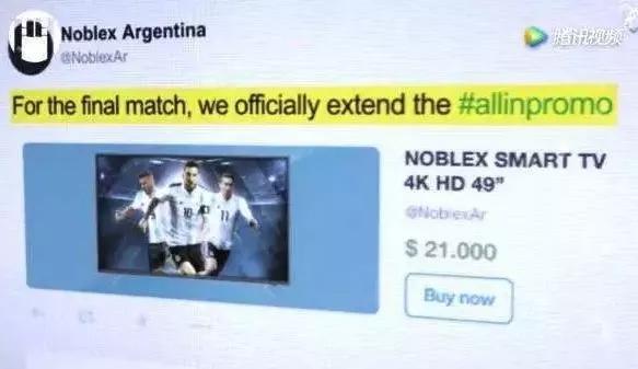 这届世界杯中,最早使用对赌营销方法的是一家名为noblex的阿根廷电视厂商。在去年的预选赛上,noblex承诺如果阿根廷未出线,消费者购买noblex旗下的4K电视会获得全部赔款。结果首批300台电视全部售罄,后来加注的1000台电视也在6小时内销售一空。