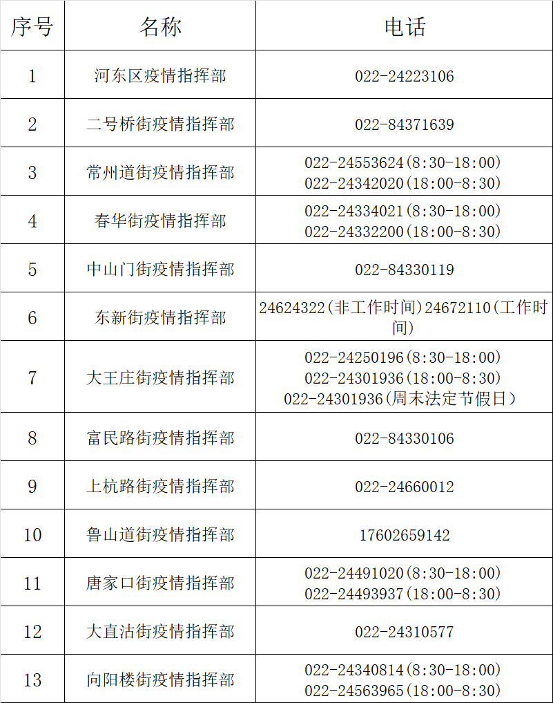 河东区指挥部和各街道分指挥部电话