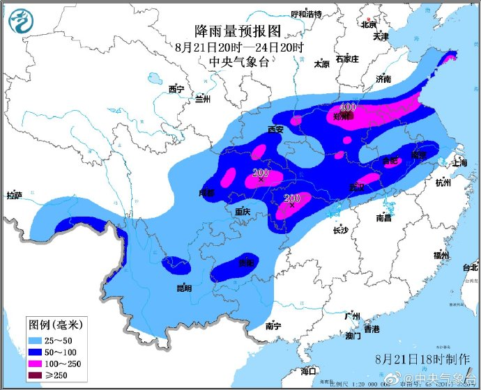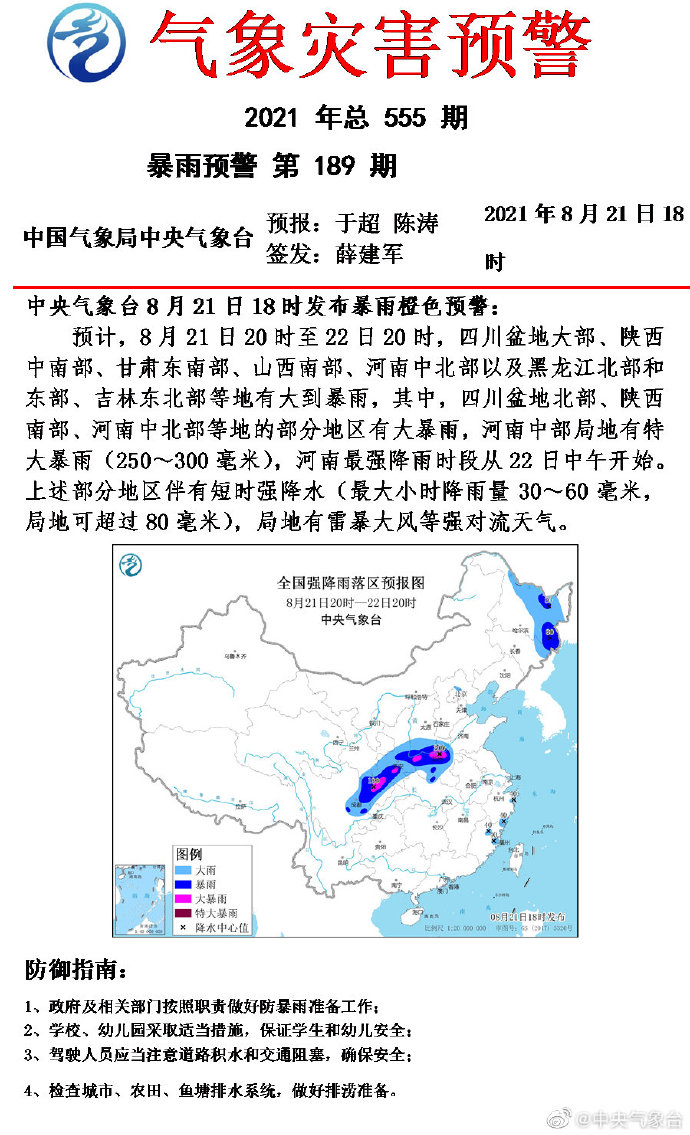 据@中国天气,预计8月21日20时至22日20时,四川盆地大部、陕西中南部、甘肃东南部、山西南部、河南中北部 以及黑龙江北部和东部、吉林东北部等地有大到暴雨, 其中,四川盆地北部、陕西南部、河南中北部等地的部分地区有大暴雨,河南中部局地有特大暴雨(250~300毫米),河南最强降雨时段从22日中午开始。 上述部分地区伴有短时强降水(最大小时降雨量30~60毫米,局地可超过80毫米),局地有雷暴大风等强对流天气。
