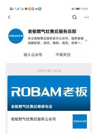 叶女士向中国市场监管报记者介绍,由于家中老板牌燃气灶无法正常打火,便从微信公众号添加窗口搜索“老板电器售后”,关注了一个名为“老板燃气灶售后服务总部”的微信公众号。叶女士按照账号内标注的400客服热线进行报修后,很快就有维修工人来上门。