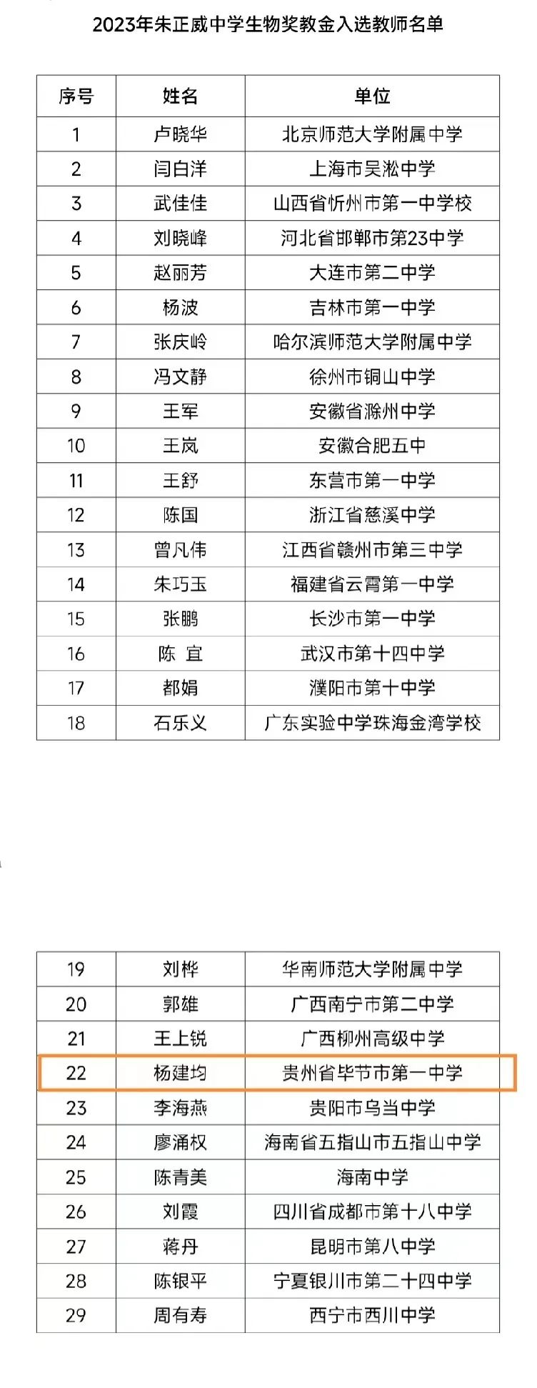 ● 近日,中国教师发展基金会公布了2023年朱正威中学生物奖教金人选名单,毕节市第一中学教师杨建均入选 。
