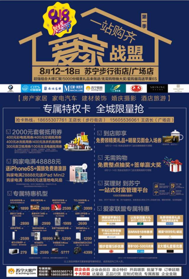 据了解,“爱家战盟第一季”也将在8月12日正式亮相,活动期间,9家联盟成员通过布展落地苏宁门店,消费者凭前期预约的专属特权证,只要到苏宁门店,不仅可享受9家联盟单位的特别优惠和服务,并确保同期最低价。还可以参与无需购物抽奖活动,5000份精美礼品到店即送,套购最高送苹果6S加免费港澳游等优惠。