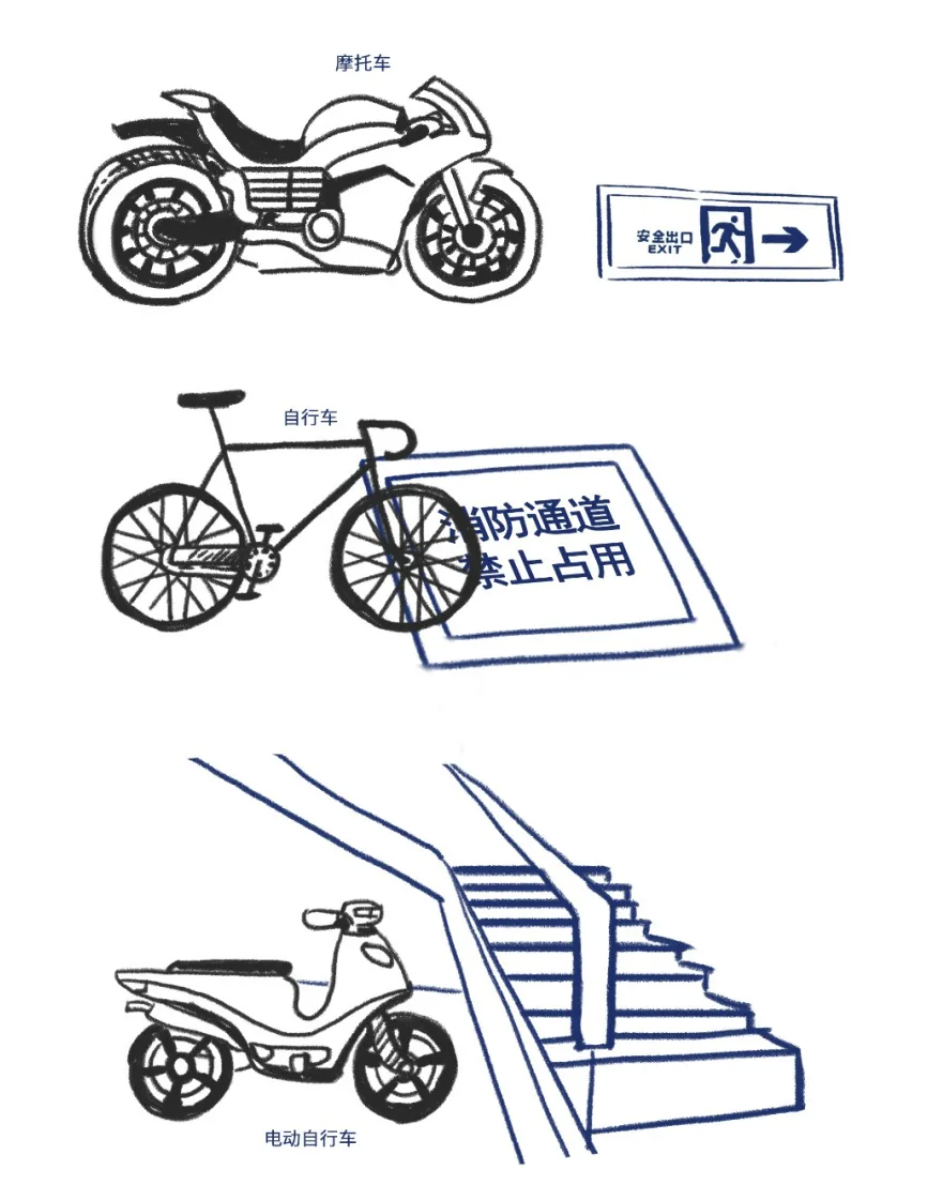 私拉乱接电线给电动车充电,并存在占用疏散通道、楼梯间、安全出口等位置的情况。一旦发生火灾,影响人群疏散。