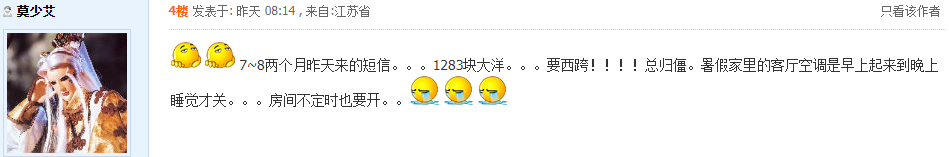 还有前面说电费3毛的。我在的昆山是跟你不一样吗。我这边第二级阶梯交的好像是7毛多呢,暑假孩子在家,已连续1个月空调没关了。前几天查了一下,快进入3阶梯了,价格更贵。 没办法啊,这天气,命是空调给的,钱是身外物。