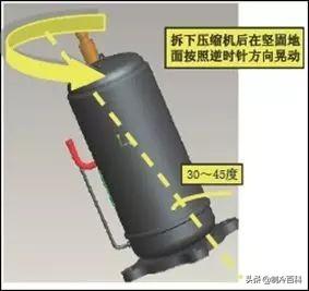 1、拆下该压缩机后,将该压缩机在坚固地面晃动,晃动角度应在30~45度之间(左图),保证沉积在压缩机底部的污染物能被倒出。