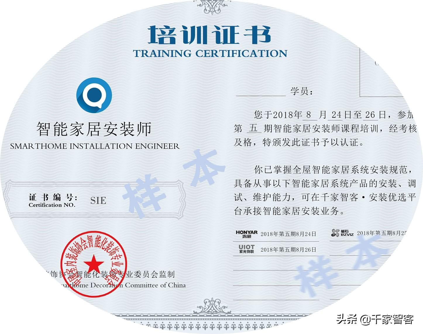 智能家居安装师培训是由千家智客培训中心与中国室内装饰协会智能化装饰专业委员会联合推出的智能家居安装调试技能与实操为主要培训内容的智能家居培训课程,每期培训为三天(包括上午、下午、晚上),传授与实操训练三个智能家居品牌产品的安装调试方法,结业考试合格颁发由中国室内装饰协会智能化装饰专业委员会监制、千家智客颁发的《智能家居安装师》证书,可以承接千家智客.安装优选平台上的智能家居安装业务。千家智客从2018年6月起,率先在北京举办“智能家居安装师培训”,随后将在成都、杭州、上海、广州、苏州、常州、深圳、武汉、长沙、厦门、西安、海口等地陆续开展。从事智能家居销售、设计、安装、运维服务的人员,或者对智能家居感兴趣的人员,都可以报名参加。