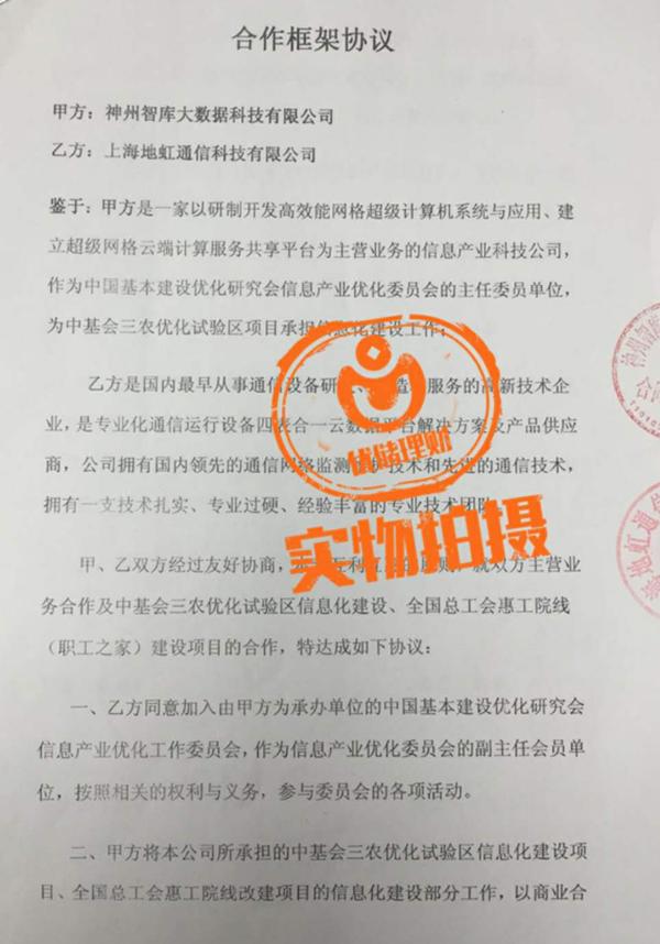 根据该网站提供的一份合作框架协议,地虹通信与一家开发高效能网格超级计算机应用系统的信息产业科技公司合作,该公司名为神州智库大数据科技有限公司。这两家公司组建项目联合小组,开发总投资50亿元的三农优化试验区建设项目和全国总工会惠工院线改造项目,属于政府惠民工程,计划5年内完成。但是具体试验区的位置和院线地址在协议中没有具体说明。