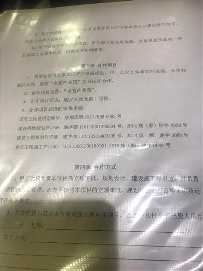 记者注意到,该协议的甲方全称为北京市全富木制品有限公司,经记者查询获悉,该公司经营范围为制造木制品、木材加工销售等业务,并没有房地产经营开发业务。此外,该协议还显示,甲方已与中关村科技园顺义园管理委员会达成了战略合作协议,甲方负责建设中关村科技园顺义园全富创客中心,乙方(购房者)同意以现金出资形式投入参与该合作项目,即“全富产业园”项目。针对协议中显示的合作事宜,记者又与多位自称为该项目的售楼人员进行核实,多位售楼员皆明确表示,“目前,该项目就是以其所建住房对外出售,并非合作开发。”