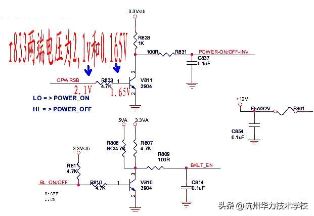 然后这里有个小变压器,这个地方跟肖特极二极管,还有芯片,它是一个 5 伏的生成电路,这边这个变压器,跟这个芯片,还有这个双向二极管,它是一个 24 伏的灯条的供电,升压的,它还同时还有一个,它是供一个 12 伏的电,用这主板上面的,这就是它的整个工作电压。